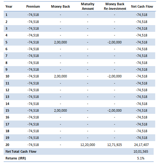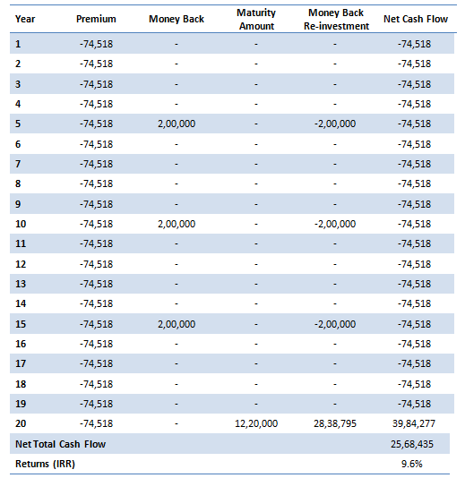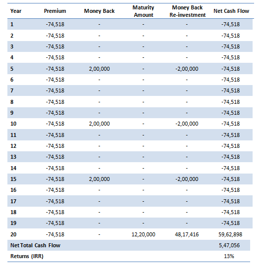 Now, if instead of using the money back during the policy term for regular consumption or planned expenditures, you re-invest fixed income or equity investment, you have the potential of earning higher returns. We will examine three re-investment options, debt / fixed income, hybrid and equity for the money back during the policy term and estimate the returns.