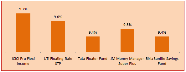 The chart below shows the last 1 year returns of some of the top rated (based on CRISIL rankings) ultra short debt funds. One should note that, the CRISIL ratings for ultra short term debt funds, is not just based on returns, but on a variety of important parameters like average returns, volatility, asset size, modified duration, dividend reinvestment, asset quality, company concentration risk and portfolio liquidity. The returns in the chart below are for the regular plans of the funds. The direct plans of the funds have slightly higher returns.