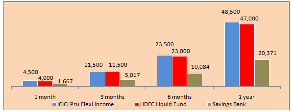 The chart below shows the pre tax returns of Rs 5 lakhs investment in an ultra short debt fund (e.g. ICICI Prudential Flexi Income Fund), liquid fund (e.g. HDFC Liquid Fund) and savings bank (with average daily balance of Rs 5 lakhs) over one month, three months, six months and one year investment time horizon.