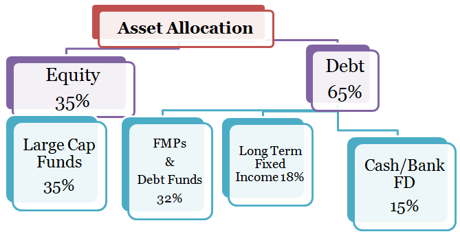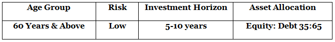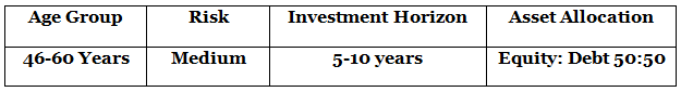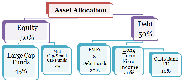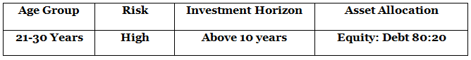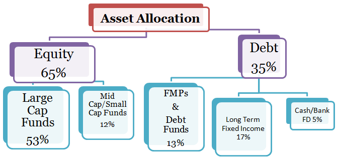 Asset allocation is largely decided by your age, risk taking appetite and investment goals. To young in the age group of 21-30 years investors, it is usually advised that they invest in equities more heavily and to balance out the risk posed by equity investments, investments in debt are to be made. To middle aged investors 31-45 years, they require security as well as returns. Hence, equal importance has to be given to equity and debts. Investors nearing the retirement age of 60 years require security of capital. Hence, they are encouraged to increase debt investments and focus less on equity.