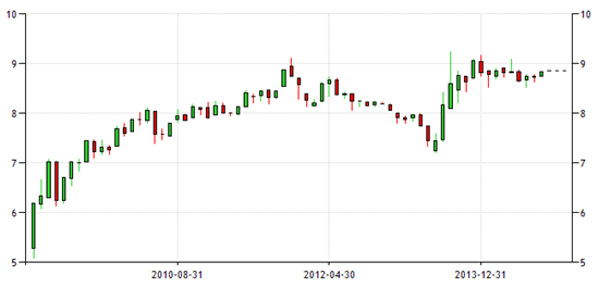 The benchmark 10 year government bond yield is at 8.8%, which is nearly at its 5 years historical high. Please see the chart below for the 10 government bond yield from Aug 2009 to Aug 2014.