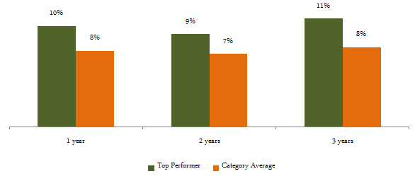 However, investors should be careful in selection of long term income funds. While long term income funds category has given trailing one year average returns of 7.7% the performance differentials between top and bottom performers have been quite significant. The chart below shows the trailing annualized 1 year, 2 years and 3 years returns of top performers and category.