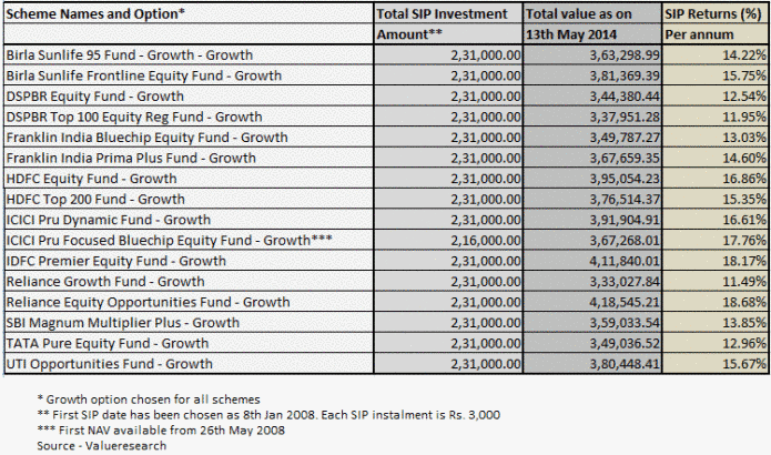 SIP RETURNS AS ON MAY 13, 2014 FOR SOME POPULAR MF SCHEMES STARTED ON 8TH JAN 2008