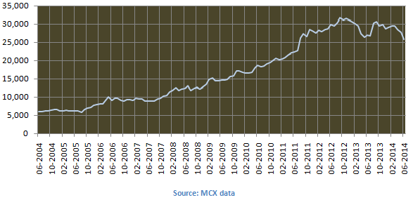 As discussed earlier, gold is an effective hedge against inflation and appreciates when equity prices correct. In fact, from Jan 2006 to Jan 20012, gold prices appreciated by 23% on an annualized basis. Over the last 10 year period, gold has given an annualize return of 16%. The chart below shows gold prices per 10 grams of gold over the last 10 years.