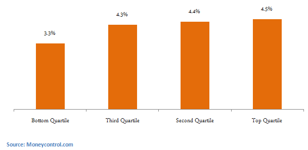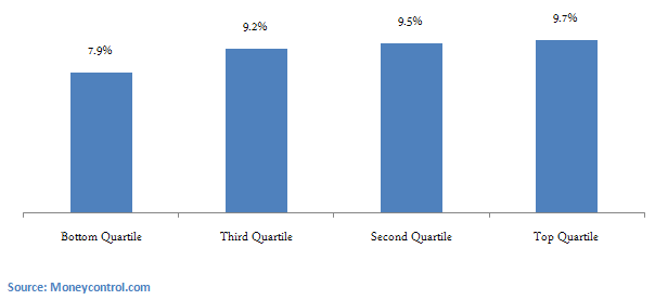 In selecting liquid funds, one must be careful and select top quality funds only. Return should not be the only consideration in selecting a liquid fund. Volatility is also a very important consideration, given the investment objective. The other important factors are liquidity and asset quality of the fund. Even though liquid funds invest in the same type of instruments, like treasury bills, certificate of deposits and commercial papers and term deposits, there is a significant difference in returns of top and bottom performers in liquid funds. The maximum one year trailing return given by a liquid fund is 10.1%, whereas the minimum one year trailing return is -2.2%. The chart below shows average 1 year returns of liquid funds in different performance quartiles.