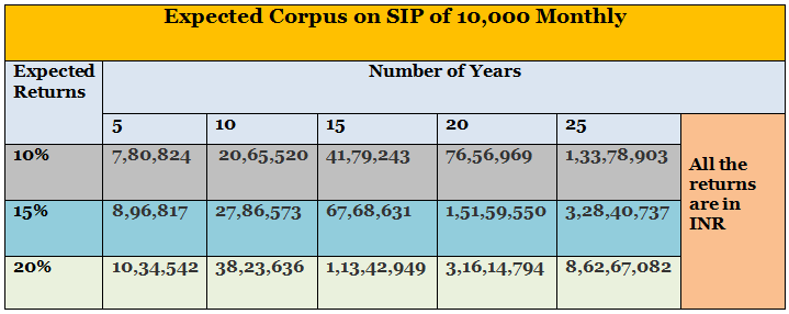 Planning for your child’s future is an important long term plan. Retirement is also one of those long term plans which require a hefty corpus. The corpus of both the plans cannot be compromised with. You child needs to study in the college he/she wants to graduate from and you need to maintain the lifestyle that you have been acquainted to. Hence, compromising one plan to make up for the other goal is not an ideal situation. Given below is a hypothetical scenario where if an investor invests 10,000 INR monthly with certain expected rate returns and what the expected corpus will be like. The table below is an illustration of the power of compounding. It reflects the various possibilities and the future value of 10,000 INR monthly investment.