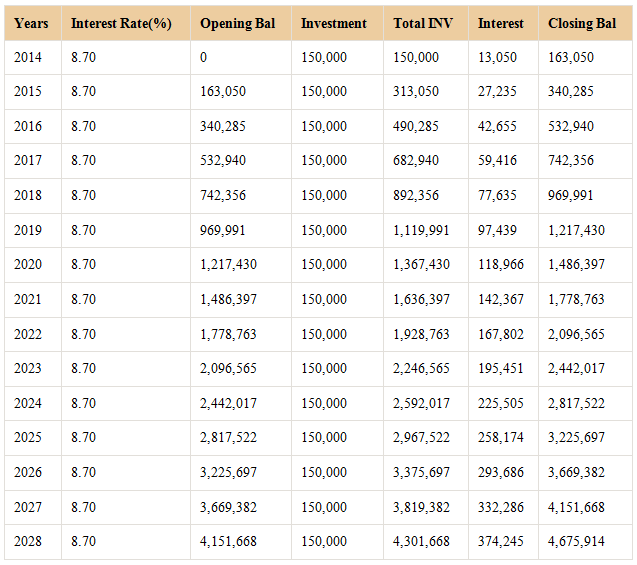 As an investor you have a moderate risk appetite or believe in being risks aversive then you have the option of investment in debt instruments such as Public Provident Fund. PPF launched by the Government of India primarily invests in corporate and government bonds and securities. This ensures moderate returns along with security. The PPF has a lock in period of seven years. Hence, this must be kept in mind while you are saving for your child’s education. The period of lock in should not clash with your time of withdrawal. Lets now look at the returns of PPF from the below chart. For example - If you invest Rs. 150,000 per annum you can generate a corpus of 46.76 Lacs in 15 years.