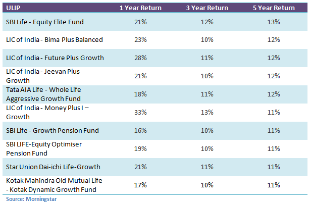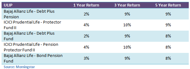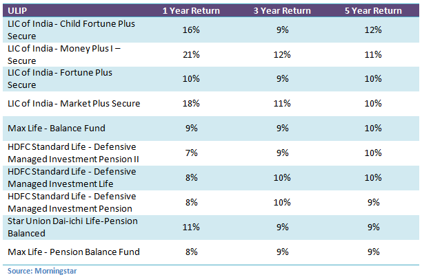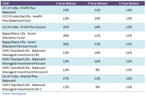 We can see that the top 10 balanced ULIP funds with moderate equity allocation have given 9 – 12% returns in the last five years. The top 10 list is dominated by ULIPs from LIC, Bajaj Allianz and HDFC Standard Life. The last one year returns of some of the LIC and Bajaj Allianz balanced ULIP funds with moderate equity allocations have been quite good. However, investors need to see, if their performance can be sustained in the future.
