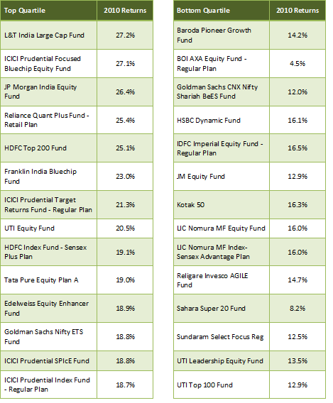 But to understand, how these funds performed relative to other funds across various time periods, we will put funds in four performance quartiles for each time period (please refer to our article, Choose Best Mutual Funds wisely: A big performance differential between top and bottom performers). Funds in the top quartile in a particular period were the best performers, and those in the bottom quartile, were the worst performers. The table below lists the funds in the top and bottom performance quartiles based on the 2010 returns. There are 14 funds in the top quartile and 14 in the bottom, out of the total 56 large cap funds in 2010.