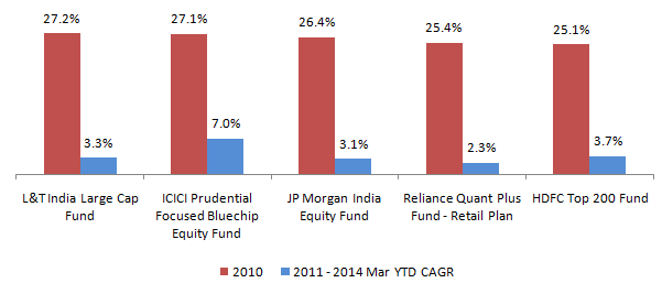 2010 was a good year for mutual funds. The average return for large cap funds as a category was 18%. For our back testing analysis, let us assume that we are in January 1 2011. We will look at the universe of large cap funds in 2010 and identify top performers on the basis of 1 year returns. At first, let us look at the top 5 performers in 2010 and compare their 2010 returns with their compounded annual returns from 2011 to 2014 March Year-To-Date. Please see the chart below.
