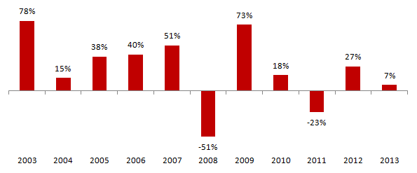 L&T India Large Cap fund was the best performer in 2010 with 27.2% returns. From 2011 to 2014 Mar Year-To-Date (YTD), the fund gave a return of 3.3%. At first glance, the return does not look very good. In fact, the 2011 – 2014 Mar YTD annualized returns from ICICI Prudential Focused Bluechip Equity fund is much higher than L&T India Large Cap fund.