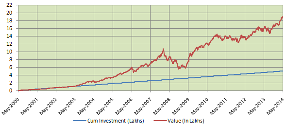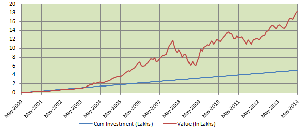 If you had started a monthly SIP of Rs 3000 only in Birla Sun Life 95 fund back in May 2000, by now you would have accumulated a corpus of nearly Rs 19 lakhs, with an investment of only Rs 5.1 lakhs. You would have accumulated a corpus of Rs 5 lakhs by the end of 2005 and a corpus of Rs 10 lakhs by the end of 2007 / beginning of 2008. You would have crossed the 15 lakhs mark by the end of 2012. Over the 14 year period from 2000 to 2014, the compounded annual returns on your SIP investment in this fund would be 17.3%.