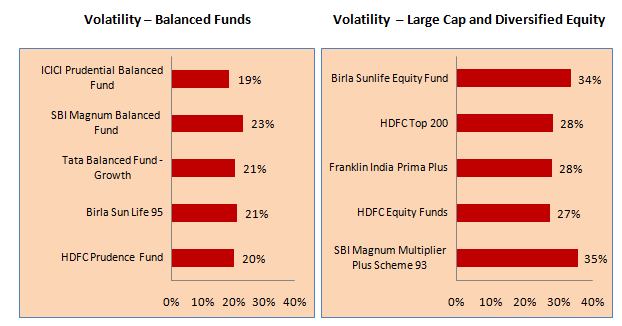 The charts below shows the comparison of annualized standard deviation of monthly returns, between balanced funds and the large cap and diversified equity funds over the same time horizon. It is evident that balanced funds are less volatile than equity funds