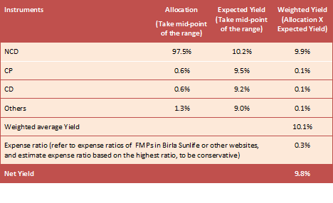 4 - Since we do not know the exact nature of instruments included in the category G-Secs/ CBLO/ REPO/ Cash Management Bills/ Fixed Deposits and mutual funds, let us be conservative and assume the expected yield is the same as call money rate, 8.85 – 9.05%. It really does not make a big difference to the final yield of the FMP, because the allocation to these instruments is only about 1.2%.