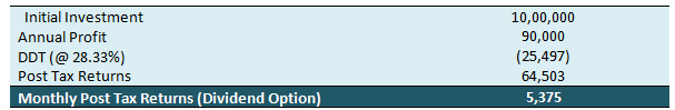 The DDT of debt funds as per the new Budget is 28.33% of the gross dividends (dividends before DDT), whereas long term capital gains tax is 20% with indexation. Let us understand the difference between DDT and long term capital gains tax. Please note that the mutual fund has to pay, Dividend Distribution Tax before distributing dividends to unit holders. So even though the dividends are not taxable in the hands of the investors, the mutual fund has to pay DDT on it. Therefore the dividends are lower to that extent in the hands of the investors. Let us assume your initial investment is Rs 10 lacs. Further let us assume you invested this amount in an income plan with returns of 9% per annum. What is the post tax annual return, if you opt for the dividend plan?