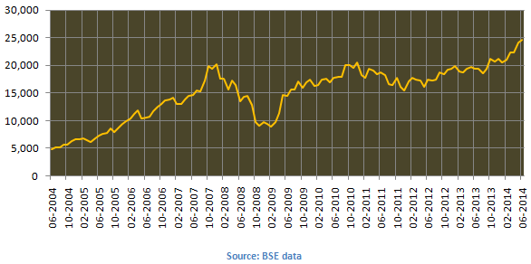 Let us compare this with Sensex returns over the last 10 years. During this period Sensex gave an annualized return of 15%. Please see the monthly price chart of the Sensex for the last 10 years.