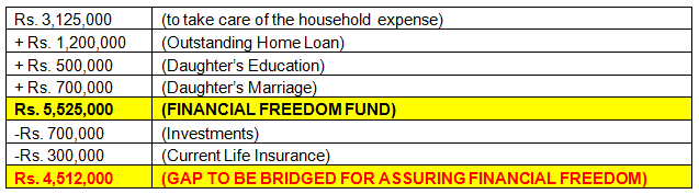 Once the Financial freedom fund is calculated we need to find out the gap which is required to bridge between the Financial Freedom Fund and your current assets and investments. And, whatever gap needs to be bridged by the life Insurance for assuring the financial freedom before it’s achieved should be done.
