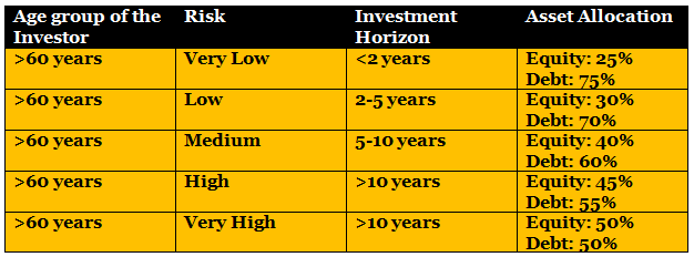 In 60s it is about safekeeping your money rather than chasing returns. Hence, asset allocation should focus on capital protection rather than capital appreciation. Asset allocation is crucial to ensure that your fixed income does not remain stagnant and keeps generating the returns without endangering the capital. Here are some possible asset allocation strategies depending on your investment tastes and preferences. In the table below it is clearly shown that an investor who is above 60, despite having high risk appetite is advised to ride low in equities. This precaution is usually doled out by financial planners who are assisting in your retirement planning. Emphasis is given to debts as it allows moderate returns with lesser risk on the capital.