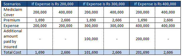 Last but not the least, your past experience on medical costs for you and your family, is one of the most important basis of determining your Mediclaim cover. For example, if you have been spending Rs 4 lakhs every year, for the past few years, on medical expenses like tests, procedures, medications etc for your family, you should opt for a Mediclaim cover of at least Rs 4 Lakhs, if not higher. You should not try to save on Mediclaim premium by opting for a lower cover, because Mediclaim does lower the cost of your family’s healthcare. Let us assume you are 30 years old. We will take two scenarios, one where you take a Mediclaim cover of Rs 2 lakhs and another, where you take a cover of Rs 4 lakhs. Let us now, examine what your cost will be in either scenario, if your medical expense was Rs 2 lakhs, Rs 3 lakhs and Rs 4 lakhs respectively. The table below shows the economics if you opt for a lower cover or higher cover (Rs 2 lakhs versus Rs 4 lakhs Mediclaim cover). Please note that, the premiums in this example are based on Max Bupa Mediclaim plans (premiums of other Mediclaim plans may be different).