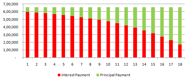 It would really depend on the return on your investment. Let us examine this, by expanding on our earlier example. To recap, you have 20 year, 12% floating rate home loan of Rs 50 lakhs, for which you pay an EMI of Rs 55,054. Let us assume you prepay Rs 1 lakh every year, while retaining your EMI and reducing the loan tenure every year. If you can prepay Rs 1 lakh every year then your loan will be fully paid by 13 years 4 months only, instead of the initial tenure of 20 years. The chart below shows the interest and principal payments of your home loan EMI, with a prepayment of Rs 1 lakh every year.