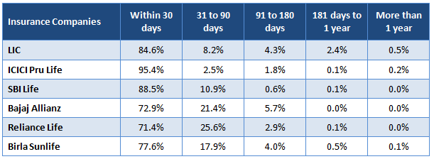 The table above shows that ICICI Prudential has settled 95% of its claims within 30 days in FY 2012 - 2013. SBI Life and LIC also settled 85%+ claims in the first 30 days.