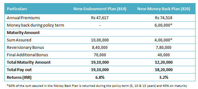For our analysis, let us revisit the example discussed in our previous article, Choosing between Endowment and Money Back Life Insurance Plans. We had chosen two new plans from LIC, the New Endowment Plan (# 814) and the New 20 year Money Back Plan (# 820). We had assumed that the insured is 30 years old and wants a sum assured of Rs 10 lakhs. The policy term is assumed to be 20 years. Since the New Endowment Plan (812) and the New Money Back Plan (820) are new plans launched by LIC this year, for the purpose of our analysis, we assumed the bonus rates for the New Endowment Plan and the New Money Back Plan to be the same as the other endowment and money back plans of LIC. The 2013 reversionary bonus rates for the LIC endowment and money back plans were Rs 42 and Rs 39 per thousand of sum assured per annum respectively. Final additional bonus for endowment and money back plans was Rs 70 and Rs 40 per thousand of sum assured respectively. The table below shows the maturity amounts, the total payouts and returns of the New Endowment and Money Back Plans.