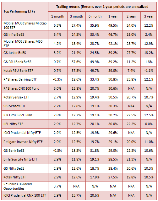 The table below shows the top performing equity oriented ETFs, along with the last 1 month, 3 months, 6 months, 1 year, 2 years and 3 years trailing returns. Please note that the 2 years and 3 years trailing returns are annualized. NAVs are as on close of trading session on, June 30 2014.