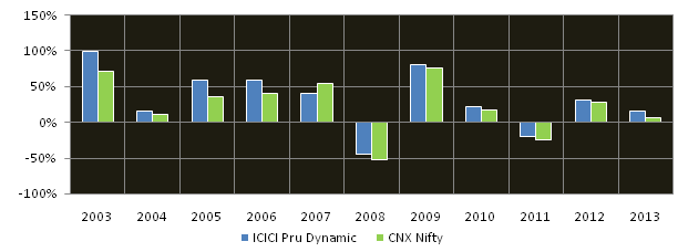 The ICICI Prudential Dynamic Plan is suitable for investors looking for high capital appreciation over a long term, with limited downside potential in volatile markets. As such the fund is suitable for long term investment objectives like retirement planning, children’s education etc. This scheme, from the ICICI Prudential AMC stable, was launched in October 2002. The fund has an AUM asset size of over Rs 3500 crores, with an expense ratio of 2.04%. As an asset management company ICICI Prudential is recognized as amongst the best performers across several mutual fund categories. The fund manager of this scheme is the ICICI Prudential CIO, Sankaran Naren and Mittul Kalawadia since 2012. Sanakaran is well renowned as one of best fund managers in the country. Sankaran previously managed the fund from 2006 to 2011. The fund has delivered strong consistent returns since its inception. See the chart below for annual returns of the fund for every year since inception, compared with Nifty returns.