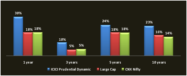 See the chart below, for the comparison of annualized returns over one, three, five and ten year periods, between ICICI Prudential Dynamic Fund (Growth Plan), Large Cap Funds category and the Nifty. Returns are based on Mar 30 NAVs.
