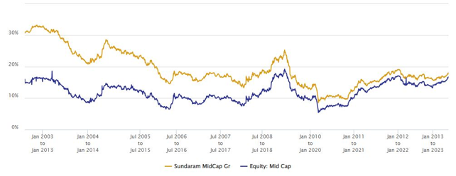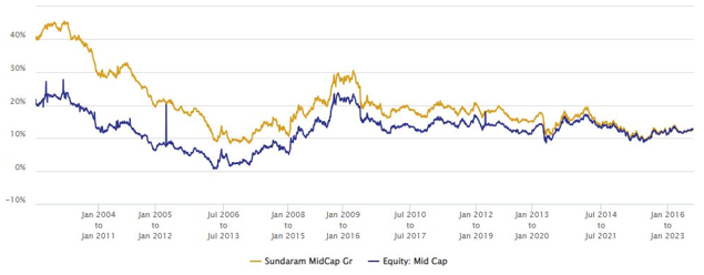The chart below shows the 7 year rolling returns of Sundaram Midcap Fund versus the midcap funds category average rolling returns since the inception of the scheme. You can see that across different market conditions, the scheme has outperformed the category average most of the times over 7 year investment tenures. The average 7 year rolling returns of the scheme since inception is nearly 20%.