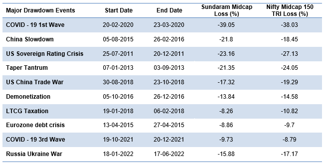 The table below shows the performance of Sundaram Midcap Fund versus its benchmark index, Nifty Midcap 150 TRI in various large drawdowns. You can see that in most major drawdowns the scheme was able to limit downside risks for investors.