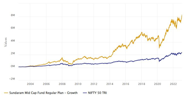 Sundaram Midcap Fund is a phenomenal long term wealth creation story. If you invested Rs 1 lakh in the scheme at the time of its launch in 2002, the value of your investment as on 23rd June 2023 would have been over Rs 80 lakhs. In other words, Sundaram Midcap Fund would have multiplied your investment by more than 80 times in the last 21 years. The compounded annual growth rate (CAGR) of investment in this midcap scheme since inception is more than 23%.
