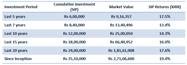 The table below shows how much money would have accumulated over different periods (as on 23rd June 2023), if you invested Rs 10,000 every month in the scheme through Systematic Investment Plan. You can see that you could have created substantial amounts of wealth by investing in this scheme through SIP over long investment tenures.