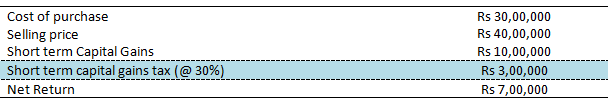 In this case, the short term capital gains tax is Rs 3 lacs and the net return is Rs 7 lacs.