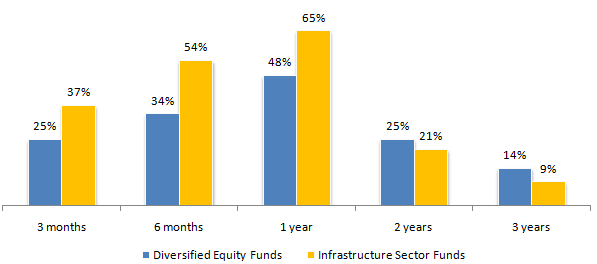 Infrastructure funds, which have been the biggest laggards in the last five years, are now making a strong comeback. Infrastructure sector funds, as a category, have given nearly 65% returns in the last year. They have clearly outperformed the diversified equity funds category, over the last one year time frame. Please see the chart below for the trailing 3 months, 6 months, 1 year, 2 years and 3 years returns of diversified equity and infrastructure funds (returns over 1 year are annualized). The trailing returns are based on NAVs of July 4 2014.