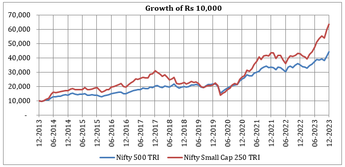Small caps have outperformed the broader markets. Observe the growth of Rs 10,000/- lumpsum investment in the Nifty 250 small cap TRI over the last 10 years compared to the returns of the broad market index Nifty 500 TRI. Notice that the small cap has mostly outperformed the broad market index returns by a wide margin. NIFTY 250 Small Cap TRI has given 20.77% CAGR returns compared to NIFTY 500 TRI which gave 16.22% CAGR returns in the last 10 years.