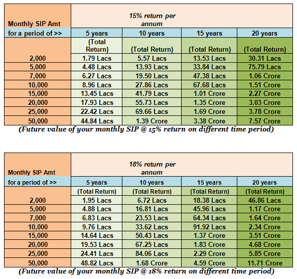 The above table contains a few illustrations of what could be the possible future values of monthly SIP investments. The future value could vary due to changes in the rate of returns generated over a period of time. If you have righty calculated your future goal value then deciding the right SIP amount should not be a problem, if you keep the return expectation little lower. For example – the fund chosen by you may show a historical annualised return of 18% but while deciding the right SIP amount you should conservatively calculate the return, say at 15% annualised. Therefore, even if in future the fund is able to generate 2-3% lesser then its historical returns, your goal amount will be achieved. Therefore, it is essential to invest the right amount because in case of shortfall for certain corpus against which options such as borrowing can push investor in financial trouble.