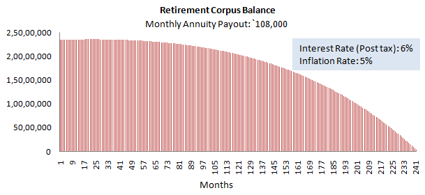 Inflation erodes the value of money over time and makes saving for retirement a tough challenge. If you are 30 years old and your monthly expense is `25,000/-, your expense will become almost `1.1 lacs a month at a 5% inflation rate by the time you retire in 30 years. How much retirement corpus you need to build just to maintain your current standard of living after your retirement? Let us assume you can earn post tax interest of 6% on your retirement corpus and the inflation rate is 5%. If you live for 20 years after your retirement, you will need a corpus almost `2.4 crores to generate monthly annuity payments of `1.1 lacs adjusted for inflation so that you can maintain your current standard of living.