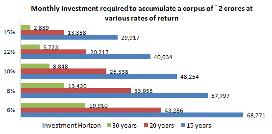 Equities, on a historical basis notwithstanding bear market periods in the interim, has consistently beaten inflation and generated superior returns compared to other asset classes over a long time horizon. Over the last 15 – 20 years the Sensex has given returns of 10 – 15%. Going back to our earlier example, if you get an average 12% return on your equity investment, you need to save only `80,000 a year over 30 years to build a retirement corpus of `2.4 crores in order to meet your retirement needs. The chart below shows the monthly investment required to accumulate a corpus of `2 crores at different rates of return over different time horizon.