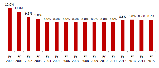 Continuing with the above example, if you get 8.7% interest on your investment, which is the highest you can earn on the post tax basis on your small savings investment (e.g. PPF), you need to save at least `1.6 lacs a year over 30 years to build a corpus of `2.4 crores in order to meet your retirement needs. The maximum amount you can deposit in PPF in a year is `1.5 lacs. The other savings schemes give lower returns on a post tax basis and therefore you need to save even more. Furthermore, over the last 20 years or so, the interest rates of provident fund, PPF and other small savings schemes have been steadily declining. The chart below shows how PPF interest rates have declined over the past 15 years.
