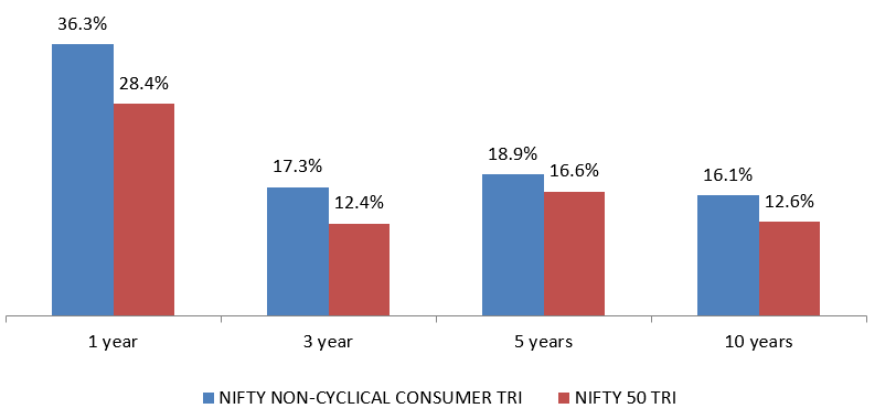 The chart below shows the 1 year, 3 years, 5 years and 10 years returns of Nifty Non-Cyclical Consumer TRI versus Nifty 50 TRI. You can see that the Nifty Non-Cyclical Consumer index outperformed Nifty 50 over long investment tenures.