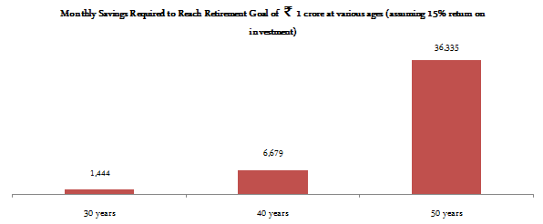 Most individuals do not think about retirement planning early in their careers, but start to worry about it only when they are nearing retirement. Starting to invest for your retirement from early age has great benefits. The earlier you start the better are the chances for creating wealth as you get more return for more time on your investments. Many investors are not aware of the power of compounding. If an investor wants to set a goal of creating a retirement corpus of र 1 crore at age 60, he or she can achieve it with a much smaller amount simply by starting earlier, as shown in the chart below.