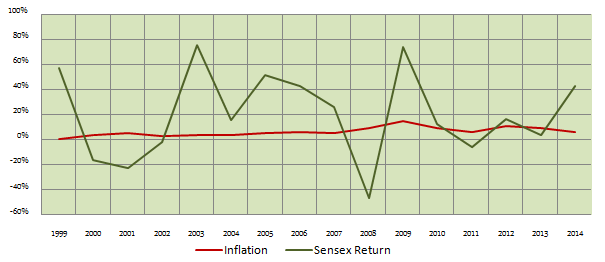 Most investors believe that investing in risk free or low risk investment options is the best retirement planning strategy. Accordingly, they opt for investment options like PPF, VPF, NSC and life insurance endowment plans. Investing in low risk investment options can actually result in taking a risk with your retirement plan. Risk free or low risk investment options often fail to beat inflation, which leaves the investor short of his retirement needs. Let us take for example life insurance endowment plans. Historically, returns of life insurance endowment plans have been around 6%, which is well below the average historical inflation rate discussed above. Post tax returns of other risk free investment options have also struggled to beat inflation. Equity as an asset class has historically been able to beat inflation in the long term and create wealth for the investor. The chart below shows the Sensex returns and the annual inflation rates from 1999 to 2014.