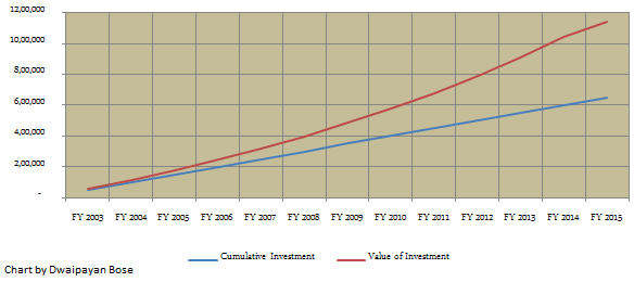 A chart produced below is self explanatory. An annual Rs 50,000 deposit in PPF started in 2002 will have a corpus of Rs. 11.40 Lacs as on September 1, 2014 against a cumulative investment of Rs 6.50 lacs. Whereas the same amount of investment in a popular ELSS fund will fetch you a corpus of Rs 37.5 lacs! The difference between the two is Rs. 26.10 Lacs.