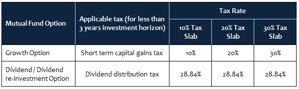 If your investment horizon in a debt fund is less than three years, you should let your tax status determine the choice between the growth option and dividend or dividend re-investment option. If you fall in the 10% and 20% tax bracket, then you should opt for the growth option. If you are in the 30% tax bracket, you should opt for the dividend or dividend re-investment option (please see the table below).
