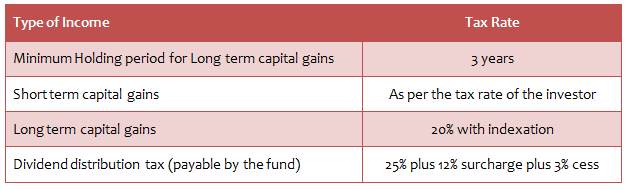 While dividends are tax free in the hands of the investor, the fund house pays dividend distribution tax before distributing dividends to investors. A number of changes have been announced in the past 12 months with respect to divided distribution tax in debt funds. The surcharge has been increased to 12% and method of calculating dividend distribution tax has been changed. The dividend distribution tax on dividends declared by debt fund schemes is 25% plus 12% surcharge plus 3% cess. Prior to FY 2015, dividend distribution tax was calculated on the net dividends received by the investor, but from July 2014 dividend distribution tax is calculated on the gross dividend, i.e. the dividends declared before DDT. The change in DDT computation method will result in slightly lower dividends compared debt fund dividends prior to FY 2015.