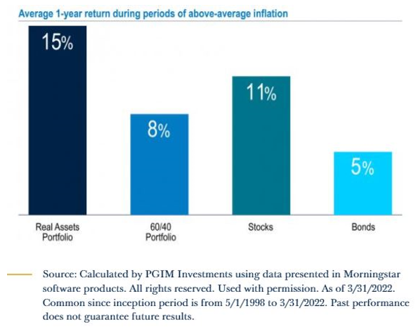 PGIM’s research shows that a prolonged period of higher inflation has important implications for investor outcomes. Strategic allocations like a 60/40 split between equities and nominal bonds have historically delivered lower real returns in periods of elevated inflation. Investors should consider larger allocations to asset classes with a positive exposure to inflation, such as commodities and real estate, given their historical strength in high-inflation environments. Real assets with a positive exposure to inflation could potentially help investors better position their portfolios for meaningfully improved outcomes.