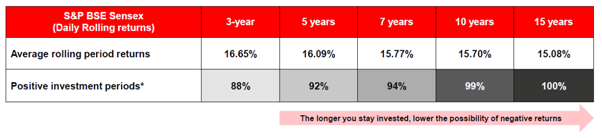 Looking at the potential upside is like looking at one side of the coin only. Any investor should also look at possibility of losing it principle. By looking at last 39 year of BSE Sensex data, we have observed that longer the investment horizon, lower is the risk of losing money in equity market. Hence, we recommend investor in to invest in equities with at least 5 year of investment horizon.