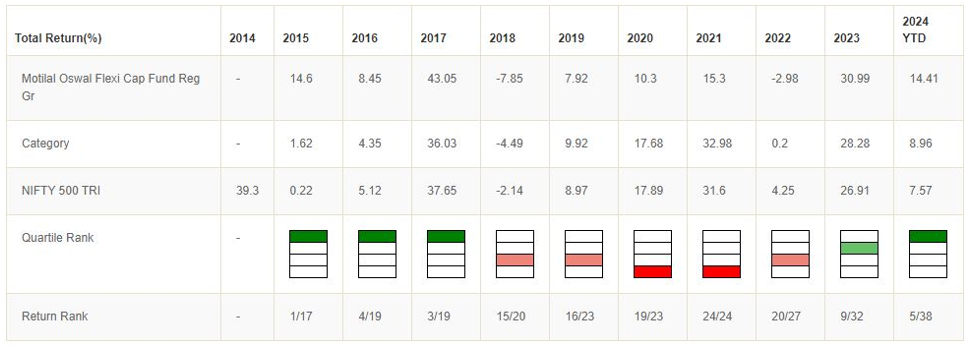 Motilal Oswal Flexicap Fund is one of the Top 5 flexicap funds. In the last 1 year, the Fund gave 53.52% return outperforming its benchmark index Nifty 500 TRI (39.26% return) by a wide margin (source: Advisorkhoj Research, as on 30th April 2024).